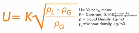 - The maximum allowable vapour velocity ‘U’ for most systems is calculated according to the Souder-Brown equation given below.