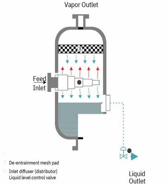 Mist eliminator placed mid-vessel with vertical upflow.